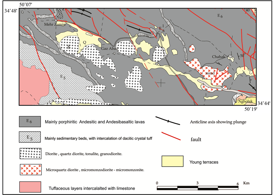 This area is located in Markazi Province with geographical coordinates to east longitude and to north latitude and is part of the magmatic zone of Urmia Dokhtar. Also, from structural and metallurgical viewpoint, it is located at the northwest corner of Central Iranian plate (Figure 2). The most ancient rock outcrops of the area are related to the Middle Triassic (Ladinian) time, which in Noghre Kamar defile are reached to the level by Tafresh fault [9] . Jurassic in north Tafresh only limited to Lower Jurassic and includes deposits made of shale and sandstone (Shemshak formation). In the Upper Cretaceous, because of orogenic event, sediments with a thickness of 1000 m and a basal conglomerate are located on old folded layers. Eocene in the studied area is very important, because in this period the volcanic activity starts and reaches its peak [10] . Eocene deposits included pyroclastic rocks, lava flows and some sedimentary rocks, which have a thickness of 3000 m. Based on sedimentary units between different phases of volcanism in the study area; Eocene series is classified into six distinct lithologic zones (Lithozone) [11] . This unit consists of basic and acidic lavas with a dominant andesite composition and