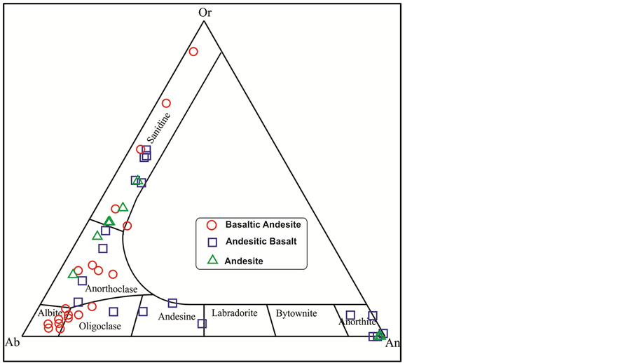 The Upper Eocene volcanic rocks in Tafresh include andesitic basalt, basaltic andesite and andesite which have constituted significant volumes of lava in the region. Plagioclase feldspar, pyroxene and olivine are the major minerals in them. Plagioclase (60% - 70%) is as phenocryst and microlite. Plagioclase phenocrysts are mostly of calcic to sodic types and their anorthite component (Xan) vary between 0.05 to 0.98 (anorthite to oligoclase), (Figure 4). Petrographic studies of plagioclases also confirm that anorthite component of the andesitic basalt rocks is much more than that of other basaltic rocks. The potassium component (Xor) of plagioclase phenocrysts vary between 0.01 to 0.90 (albite to sanidine). Pyroxene phenocrysts are clinopyroxene and orthopyroxene. Pyroxene as orthopyroxene is the dominant phase in andesitic basalts. According to the classification of Deer, Howie and Zussman [13] the pyroxenes of andesitic basalts have hypersthene and pigeonite composition. However, calcic pyroxene (augite) is also seen. The basaltic andesite rocks contain iron pyroxene with a compositional range from En3Fs51Wo10 to En13Fs78Wo38 (Figure 5). The andesitic rocks are characterized by Ca-rich pyroxenes with hedenbergite composition which show compositional range from En2Fs43Wo38 to En12Fs51Wo46 (Figure 5). According to the classification of Morimoto [14] , pyroxenes often are located in the ranges of A and D. Two possible processes can explain the existence of iron-reach portion (hedenbergite-ferrosilite) in basaltic andesite and andesite rocks, (1) opacitization and oxidation of the pyroxenes with removal of calcium and magnesium as carbonate from minerals, and (2) remove of calcium as well as fixing magnesium in some clinopyroxenes. According to Figure 6 olivine ranges in composition from Fo19 to Fo24 show ferrohortonolite composition.