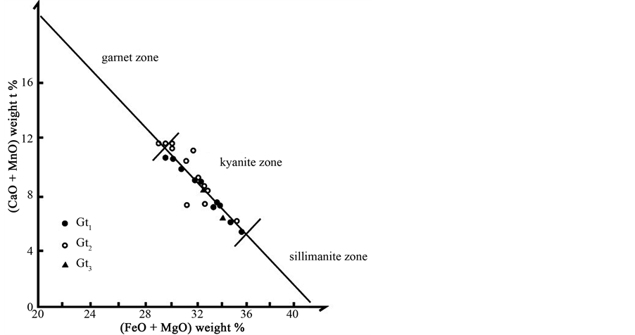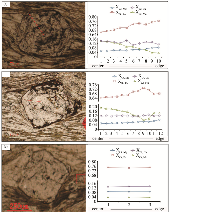 Probe data show that garnets studied here have distinct compositional zoning. Garnet composition zones are generally formed by growth causes or diffusion causes. Growth zoning is caused by various factors such as ma- terial supply in the process of garnet growth at different stages. Diffusion zoning is a result of intergranular diffusion in the crystal growth process or of ion exchange reaction or pure conversion reaction after garnet stopped growing [11] . Growth zoning is characterized by increased Mg percentage and decreased Mn percentage with temperature increase [12] , and especially by bell-shaped Mn profile. The garnet probe data of our samples show typical characteristics of the growth zoning, and zones in the garnets are growth zones. These garnets can be used to estimate the temperature of its environment.