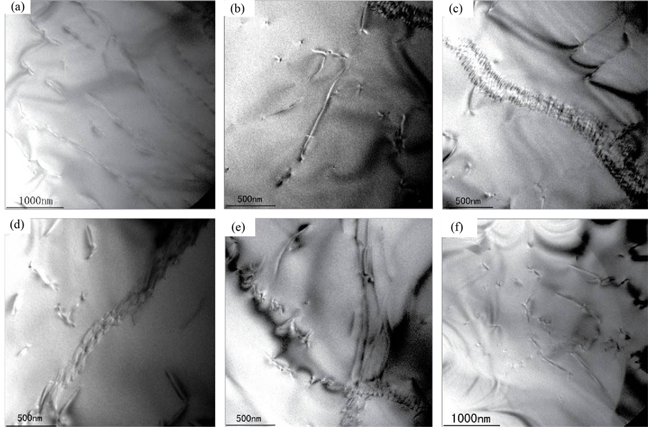 Figure 6. TEM photos of garnet (Gt3). (a) Straight free dislocation; (b) Free dislocation and dislocation bow; (c) (d) Dislocation wall; (e) Dislocation bow and dislocation wall; (f) Free dislocation and the water molecules.
