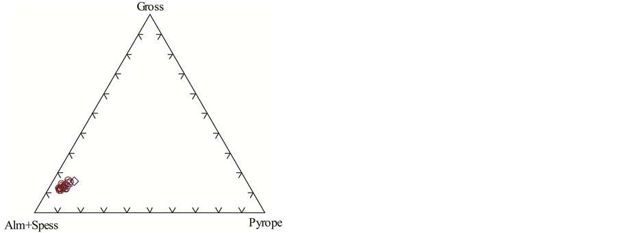 The garnet compositions are projected in the Coleman garnet classification diagram (Coleman, 1965). Garnet composition data are all plotted in almandine zone (Figure 3), and the average composition is that almandine is about 67% - 87%, calcium aluminium garnet approximately 13% - 24%, and pyrope approximately 2% - 12%. Gt1 garnets comprise 66.83% - 76.42% almandine, 3.63% - 13.82% spessartine, 10.65% - 14.08% essonite, and 5.27 - 8.46 pyrope. From the center to the margin, the molecular content of almandine garnet stone and pyrope