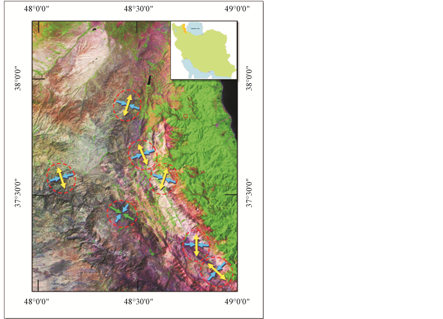 The study area has located in West-Central Alborz-Lesser Caucasus physiographic province (Figure 1). Dominant structural trend in this province is NW-SE. From tectonics view, it contains deformed zone (fold and thrust belt) of Cimmerian miniplate that formed in northern active margin until late Triassic. Then it has rifted by tension in a back arc basin of Neotethyian subduction zone in the south margin of Cimmerian miniplate. Development of that rift stopped in the late Cretaceous and then, renewed in the Eocene by spreading in submarine arc basin of Neotethyian subduction zone. In other words, this hinterland is a result of a magmatic arc system spreading in the evolutional back arc basin. After that, West-Central Alborz and Lesser Caucasus hinterland has formed by deformation and regional uplift from SW part of Caspian Sea to Black Sea [1] - [3] . Based on previous works on the salt and mud diapirism [4] - [15] and neotectonic regime in Iran [16] - [21] , Zagros in south Iran is the most active zone [22] - [42] . Then, Alborz [43] - [82] and Central Iran [83] -[98] have been situated in the next orders.