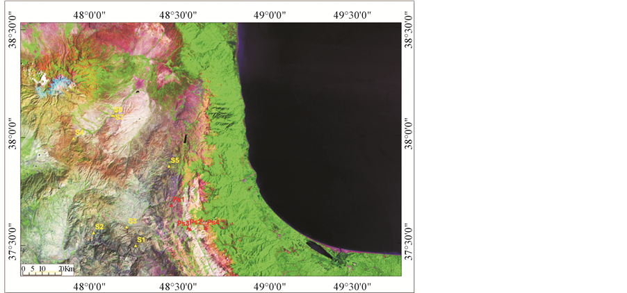 In the study area, from about 12 stations, in the longitude the range of 48˚ to 49˚ samples were that’s part of the Talysh Mountains and Western Alborz belt (Figure 6). Stations in place of the Talysh Mountains turns bending in place rotate the belt West Alborz and changing trend of the structures of the North East to the South West of the South-North-South, South East and South West of Ardabil province are focused. Because of possible impact of the magnetic minerals on lands and changing the chemical composition or spin them in the vicinity of faults the choice of the sampling stations at a distance of at least of the main fault. Most stations (PS1, SP2, S1, S2, S3, S4) of the igneous units includes basalt up to andesite from the Eocene period of up to quaternary. And the number of stations of the unit stone includes marl shale, and sandstone (S6, PS3, SP3, S7, S3) was removed from any station 15 - 8 sample preparation and from sample of every sample was obtained manually (Table 2).