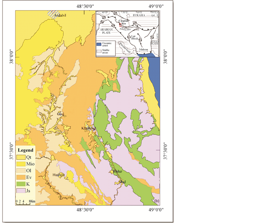 The study area (Figure 1) is located in the southern range of Ardebil in the West Alborz Mountain. Alborz mountain belt with several thousand kilometers between the Caspian Sea and the Central Iran has situated. It is a part of the Alpine-Himalaya belt that located between Eurasian and Cimmerian plates.