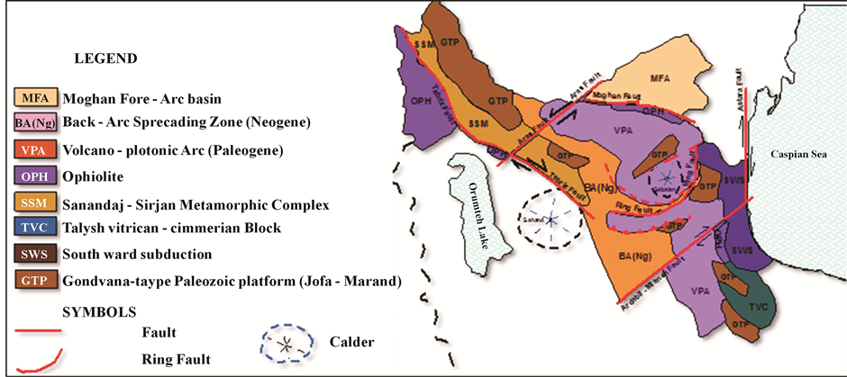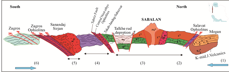 3) Tectono-magamatic reactivated zones in Neocene (with oblique trend related to Paleogene volcano-plu- tonic arc) that formed the volcanoes (like the Sabalan) and uplifting intrusive doming (Qusheh Dagh).