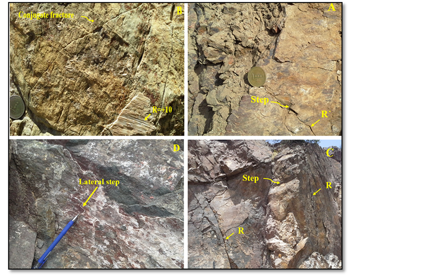 Figure 4. (A) and (C) R and R’ fractures along with the fault step, (B) and (D) the amount of the rick angle and scratches line on the surface of the fault.