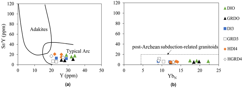The fresh and least-altered diorite and granodiorite were selected to discriminate between typically arc rocks and arc adakite. In the commonly used Sr/Y versus Y diagram, the diorite and granodiorite dominantly plot in typically arc (Figure 9(a); [30] ). This result is consistent with relatively unfractionated HREE patterns of the samples plotted in Figure 6, which implies that partial melting occurred at a depth above the garnet stability field that would be shallower than the subducted slab. Furthermore, based on the (La/Yb)N versus YbN diagram, the diorite and granodiorite plot in the field of post-Archean subduction-related granitoids (Figure 9(b); [31] ). This is in the good agreement with the conclusion of [32] who assumed that the Southeast Asian margin was an Andean-type volcanic arc from mid-Jurassic to mid-Cretaceous.