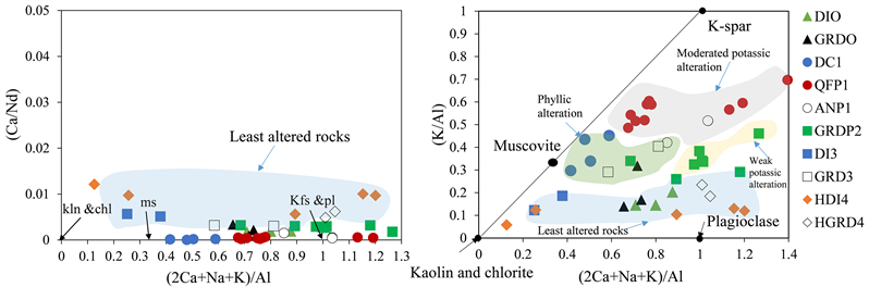 In the PER diagram (2Ca + Na + K)/Nd versus Ca/Nd (Figure 7(b)), quartz feldspar porphyry and andesite porphyry are only moderately altered while dacite exhibits the highest alteration indices. Rock units with highest alteration are indicated by muscovite (sericite) alteration. Moreover, the behaviour of K during alteration can be broadly understood in the PER diagram of K/Al versus (2Ca + Na + K)/Al for felsic lithologies (Figure 10(b); [24] ). These diagrams spatially provide the location of the main alteration minerals by discriminating between potassic, sericite and argillicalteration for felsic and intermediate lithologies. The least altered rocks plot closer to (1, 0) while potassic alteration mineral (K-feldspar and biotite) plot towards the (1, 1), muscovite plot at (1/3, 1/3) and kaolin group minerals and chlorite plot at (0, 0). General and Pearce element ratios can identify the three alteration in the Halo prospect such as potassic (secondary K-feldspar and biotite), phyllic (sericite) and propylitic (epidote) alteration. Results are also consistent with petrography (Figure 3, Figure 10).