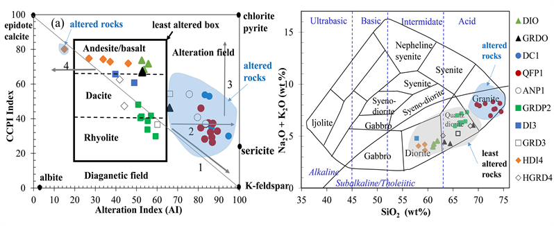 Pearce Element Ratios (PERs) diagrams can discriminate between the effects of hydrothermal activity and unrelated events such as weathering or metamorphism. Moreover, these diagrams also can determine the alteration index (AI) by identifying the slop of the line connecting the sample point and its origin. AI is defined by dividing the ordinate value (y-axis) with absicca value (x-axis) [24] . AI values were rescaled so that a value of 1, representing AI of an unaltered samples as 0%, and AI of totally altered rocks as 100%. AI of the quartz feldspar porphyry and the andesite porphyry associated potassic alteration ranges from 11.8% to 32.3% and that of the dacite associated with phyllic alteration ranges from 43.3% to 66.6% while that of two samples of granodiorite porphyry ranges from 5.1% to 11.9%. The highly altered zones are commonly vectoring towards the center of the hydrothermal system which can represent the locus of mineralization (e.g. [22] & [24] ).