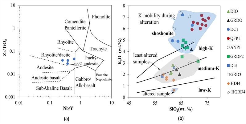 Figure 5. (a) Zr/TiO2 versus Nb/Y diagram derived for volcanic rocks of [15] ; (b) SiO2 versus K2O (wt.%) diagram of [16] . Abbreviation: DC1and ANP1: dacite and andesite porphyry, respectively, in drill hole HD1 and other symbols are the same as in Figure 4.