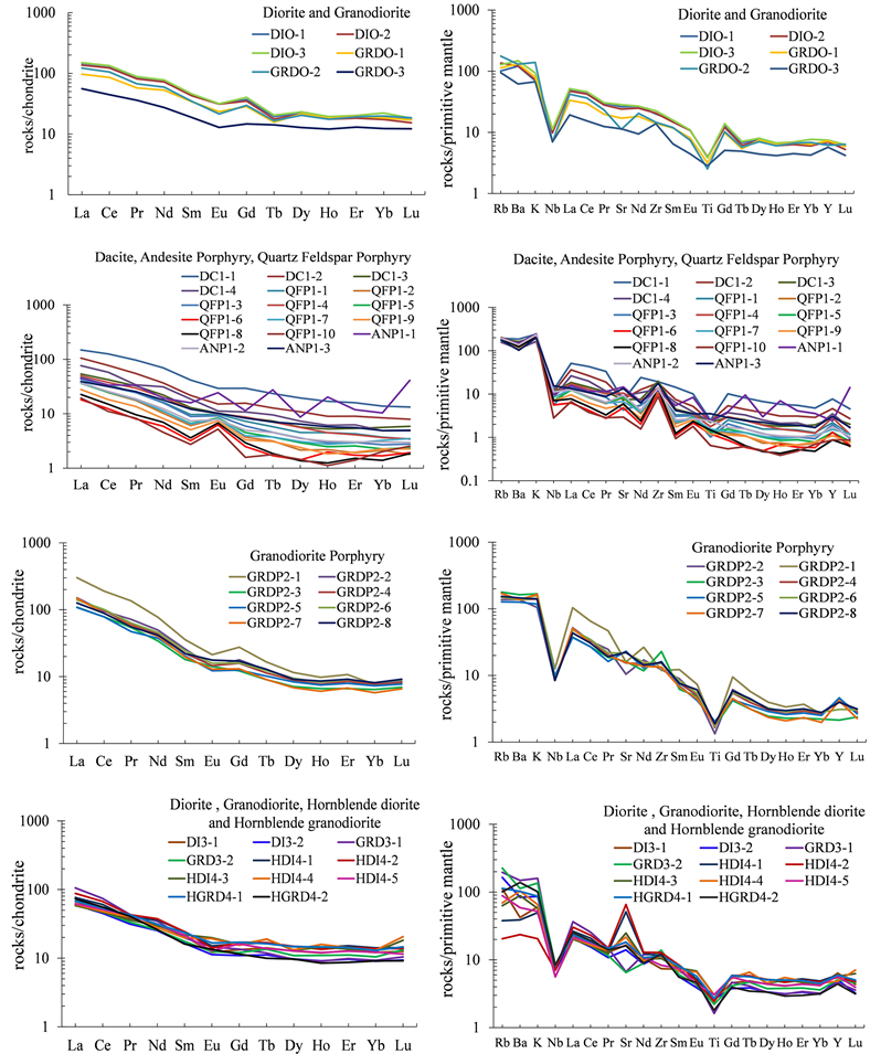 Figure 6. Chondrite-normalized rare earth element and primitive-mantle-normalized trace element patterns of intrusive and volcanic rocks in the Halo prospect [18] . Abbreviation: DIO-1 to DIO-3 and GRDO-1 to GRDO-3: diorite and granodiorite, respectively, exposed on surface; DC1-1 to DC1-4, ANP1-1 to ANP1-3, and QFP1-1 to QFP1-10: dacite, andesite porphyry and quartz feldspar porphyry, respectively, in drill hole HD1; GRD2-1 to GRD2-8: granodiorite porphyry in drill hole HD2; DI3-1 to DI3-2 and GRD3-1 to GRD3-2: diorite and granodiorite, respectively, in drill hole HD3; HDI4-1 to HDI4-5 and HGRD4-1 to HGRD4-2: hornblende diorite and hornblende granodiorite, respectively, in drill hole HD4.