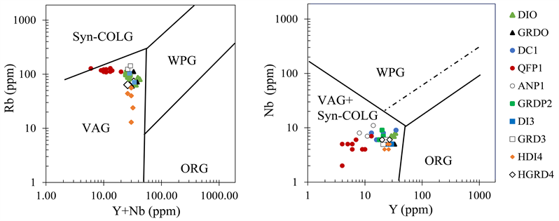 The enrichment of LILEs and depletion of Nb and Ti are characteristic feature of magmas generated in a subduction-related tectonic setting ( [25] & [26] ). The low Nb depletion is typical of calc-alkaline magmatic rocks formed in subduction zone environments and may be regarded as an indicator of crustal involvement in magmatic process ( [27] & [28] ). Moreover, in the (Y + Nb) versus Rb, and Y versus Nb diagrams (Figure 8; [29] ), samples plot within the field of volcanic arc granite. It is consistent with the lithochemistry of porphyry copper-(molybdenum-gold) deposits formed by magmatic-hydrothermal fluids generated from subduction related magmatism.
