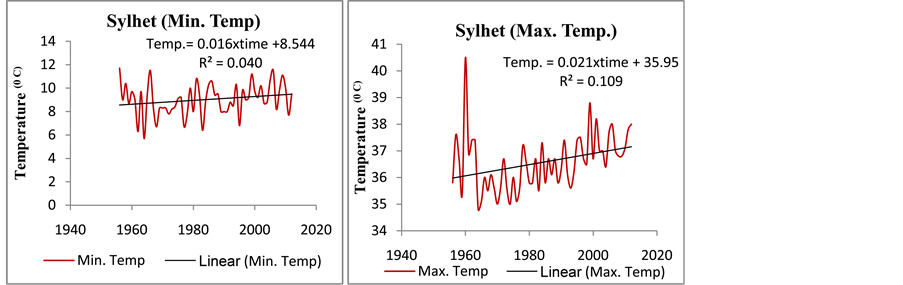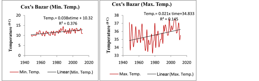 The linear trend analysis (Figure 2, Figure 5, Table 2) revealed that the maximum temperature increased significantly by 0.021 degree Celsius per year in Cox’s Bazar and Sylhet.