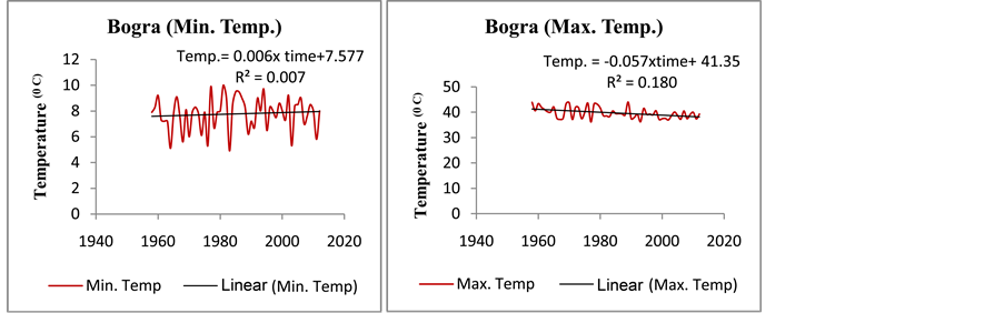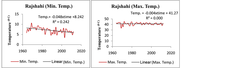 In case of minimum temperature highest increase was found in Dhaka by 0.049 degree Celsius followed by Cox’s Bazar (0.038 degree Celsius per year) whereas significant decrease has been found in Rajshahi by 0.047 degree Celsius per year (Figures 1-3).