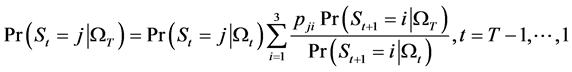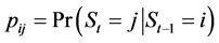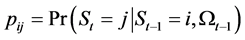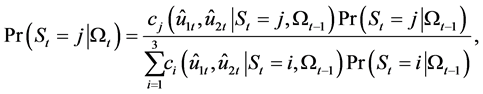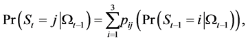 Although the two later studies provide interesting findings about the existence of structural change in the dependence structure and the instability of the copula parameter, they do not give information about the existence of regime change in the dependence. In this paper, we propose a novel regime switching copula model that allows for regime change in the copula parameter in order to identify the financial crisis regime through the time-varying dependence structure between oil price changes and six GCC stock market returns. Interestingly, we employ Markov-switching copula functions that permit the copula parameter to evolve according to three regimes (pre-crisis, during crisis and post-crisis) depending on the state of an unobserved Markov chain with corresponding transition probabilities as suggested by [28] .