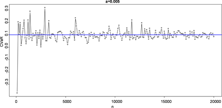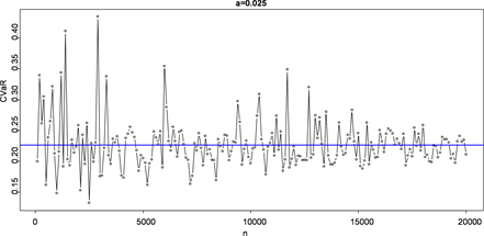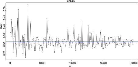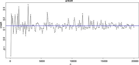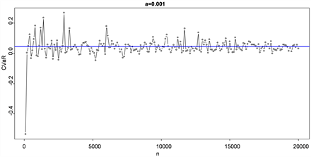 size is , α is 0.001, 0.005, 0.01, 0.025, 0.05 respectively and the simulated step length is 100. In Figure 1, the blue horizontal line represents the true value of CVaR, and the points represent the estimated value of CVaR. So we can get the conclusion that when the sample size is the same, the smaller the value α is, the faster the convergence speed will be, the better the effect will be. For the α, the CVaR estimations fluctuate on its true value; the fluctuation is smaller with the increase of sample size. It is easy to see that is less than 0.02 between the CVaR estimate and its real value when the number of sample n satisfies . In order to improve the accuracy of simulation, we continue to expand the sample size and get Table 1 eventually.