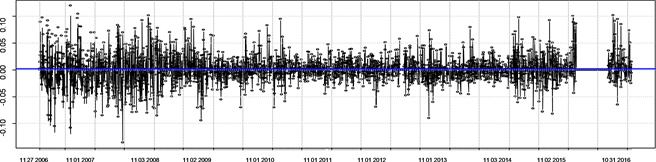 In this figure, the circle represents the real logarithmic yield of Vanke A, and the blue horizontal line represents the average logarithmic yield of the corresponding day. We can get the conclusion that real logarithmic yield of Vanke A always fluctuate around the average ones from this figure.