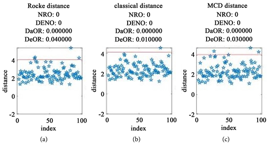 cannot detect outliers. However, both robust Mahalanobis distances still maintain good robustness and can accurately detect outliers. In the 30-dimensional data setting, the detection results of the three Mahalanobis distances are also similar when there are no outliers. After the outlier ratio is increased to 20%, the classical Mahalanobis distance is still unable to detect the outliers. In addition, the detection result of the Mahalanobis distance based on MCD estimator has been greatly deviated. However, the Mahalanobis distance based on Rocke estimator can still accurately detect the outliers. Therefore, the Mahalanobis distance based on Rocke estimator can accurately detect the outliers in both low-dimensional data set and high-dimensional data set.