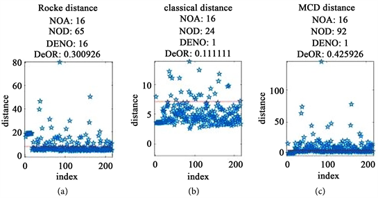 In this section, we apply the proposed methodology to analyze the Breast Cancer Wisconsin (Diagnostic) Data Set (1995) [20] . The data set contained 30 test variables with a total of 569 data, of which 357 were diagnosed as benign and 212 were diagnosed as malignant. Classification by characteristic variables of the sample can distinguish between benign and malignant (Wolberg, Street, Heiseyand Mangasarian) [21] . Therefore, for data diagnosed as benign, data diagnosed as malignant is equivalent to the contaminated data. Adding contaminated data to the data diagnosed as benign with data diagnosed as malignant, and use as the threshold. In the following, we apply the above three methods to detect outliers, and obtain the number and proportion of detected outlier and the scatter plot. Since the actual data may contain a certain proportion of outlier, it is not advisable to add too much data when the data diagnosed as malignant is used as the outliers. The first 200 diagnosed as benign data were taken, and 0 and 16 (100th to 115th) of the data diagnosed as malignant were sequentially added. We also calculate the number of outliers added (NOA), the number of outlier detected (NOD), detected the corrected number of outliers (DENO), and detected outliers rate (DeOR). The results are shown in Figure 9 and Figure 10.