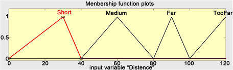 Distance Fuzzification for input one, by Taking input and determine the degree to which belong to each set of the appropriate fuzzy sets via membership functions.