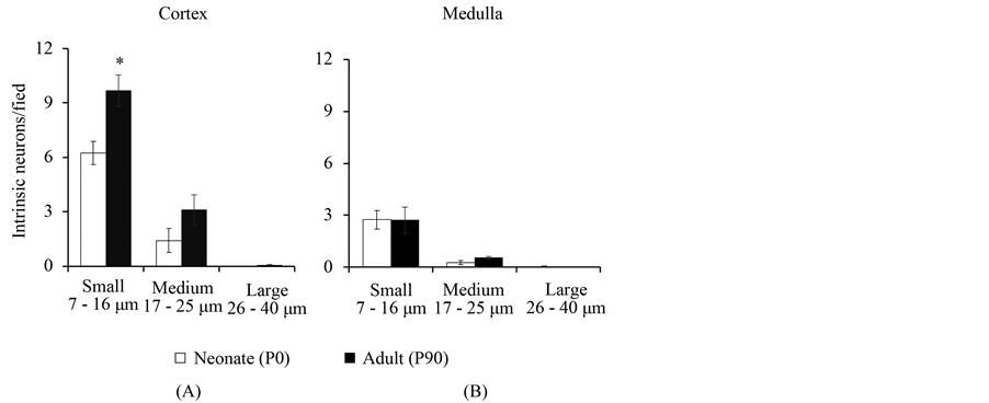 Using the size of the cell body, the ovarian intrinsic neurons were classified as small [7 - 15 μm (33.1% vs 46.3% for the neonate and adult, respectively)], medium [15 - 16 μm (6.2% vs 13.6% for the neonate and adult, respectively)] or large [26 - 40 μm < 1% at both ages], located both in the cortex and in medulla of the ovary. In the ovarian cortex, the number of small neurons in the neonate ovary was 6.2 (23%) and in the adult ovary the number was 9.7 (36%), 0.6 times higher than the neonate ovary (Figure 1(A)) (*p < 0.05, Student t-test). The number of medium neurons was 1.4 (5.2%) and 3.1 (11.6%) in the neonate and adult, respectively, and the num- ber of large neurons was <1% at both ages (Figure 1(A)), the number of neurons was not statistically significant (Figure 1(B)) (Student t-test). In the medulla of the ovaries, the number of neurons was similar in the neonate and adult: small neurons 2.7 (10.1%) and 2.7 (10.1%), respectively; medium neurons 0.3 (1.1%) and 0.6 (2.2%), respectively and the number of large neurons was <1% at both ages. There was no statistical significance between any of these values (Figure 1(B)) (Student t-test).