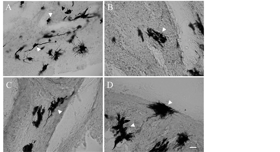 Figure 3. Neurons and ganglia in the adult guinea pig ovary visualized by Golgi-Cox impregnation. In the ganglia, the neurons had fusiform and rounded cell bodies. The neurons or ganglia are marked with arrowheads. Scale bar, 20 µm.