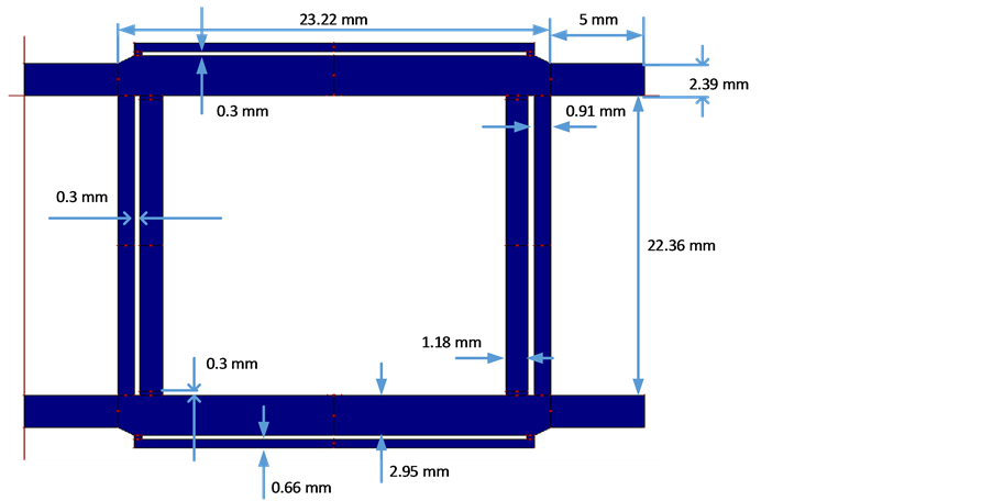 Table 2 shows the calculated dimensions of the 3 dB BLC. CST [19] and IE3d [20] simulators are used to obtain the S-parameters of the 3 dB BLC after adding a slits of widths of 0.3 mm to the coupler’s branches Figure 9(a). It should be noted that the coupler’s branches are still connected at its edges. The optimized dimensions using CST and IE3D are given in Table 2. The difference in dimensions between the theoretical results and numerical results (IE3D and CST software) is attributed to the fact that, in theoretical calculations, each of the boundary conditions and the coupling between adjacent branches are not taking into consideration which make the effective branches width seem be larger in size in the off state, the microstrip transmission section could be considered as asymmetric coupled microstrip lines. In general and ignoring the longitudinal electromagnetic field components the quasi-TEM approach could be used in the analysis of asymmetric two coupled microstrip lines separated by distance