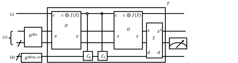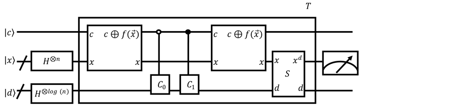 Figure 1. Quantum circuit for random walk search algorithm. The box marked as T is the random walk search iteration and shoud be repeated t times. The value of t is shown in Section 3.