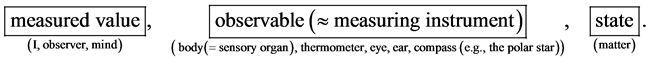 (A3) it is clear that there is no measured value without observer (i.e., “I”, “mind”). Thus, we consider that measurement theory is composed of three key-words (f. ref. [5] ):