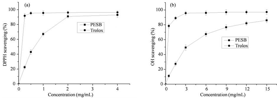 were tested for this activity in this study by the DPPH and hydroxyl free radical scavenging assays. As shown in Figure 3, the extraction was effective in reducing DPPH (A) and hydroxyl radical (B). Scavenging ability of PESB was lower than that of trolox at all investigated concentrations. But scavenging ability of PESB is closed to trolox at the concentration of 2.0 mg/mL and another is 12 mg/mL. Interestingly, PESB exhibited a stronger DPPH scavenging activity than hydroxyl radical. Radical scavenging activity was strongly correlated to the extraction levels, since all of the tested samples exhibited antioxidant activities in a concentration-dependent manner.