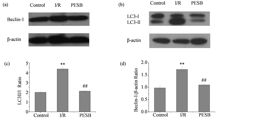 Figure 4. PESB inhibited the degree of autophagy in isolated rat hearts subjected to I/R. (a and b) Western blotting was performed with protein for the expression of autophagic marker proteins including Beclin-1, LC3II and LC3I. (c and d) The quantification of Beclin-1 and LC3-II/LC3-I was performed. Results are expressed as mean ± SD. ##P < 0.01 compared with control group; **P < 0.01 compared with I/R group.