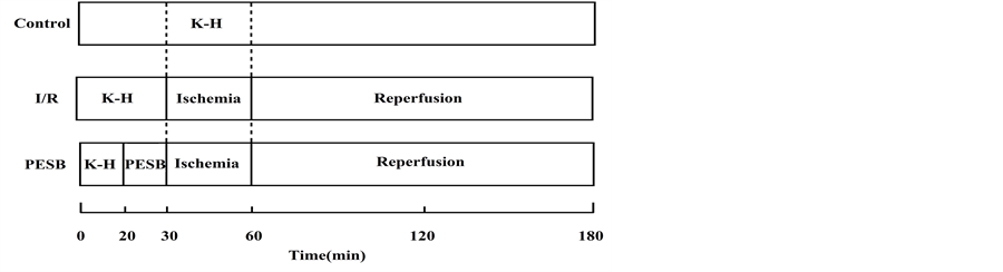 The rats were randomly divided into three groups: control group, I/R group and PESB treatment group. Before surgery, rats were housed in quiet rooms and had free access to food and water for one week. Next, the model of myocardial I/R injury was built. Control group was perfused for 180 min. I/R group was stabilized for the first 30 min, followed by 30 min of global ischemia with ice-cold K-H solution and reperfused for 120 min finally. PESB group was first stabilized for 20 min, and then K-H solution with PESB, global ischemia and reperfusion were established for 10, 30 and 120 min, respectively (Figure 1).