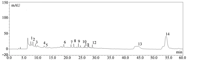 Figure 2. Representative high performance liquid chromatography profile of the polyphenol extracts from sea buckthorn berry. Chromatograms of sample under detection wavelength of 278 nm. Gallic acid (peak 1), proto catechuic acid (peak 2), (+)-catechin (peak 3), caffeic acid (peak 4), chlorogenic acid (peak 5), ferulic acid (peak 6), p-coumaric acid (peak 7), salicylic acid (peak 8), cinnamic acid (peak 9), quercetin (peak 10), phlorizin (peak 11), rutin (peak 12), kaempferol (peak 13) and isorhamnetin (peak 14).