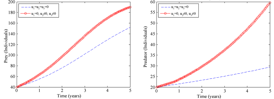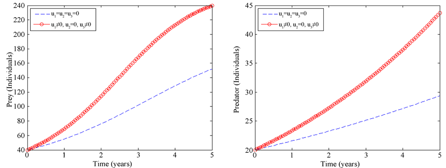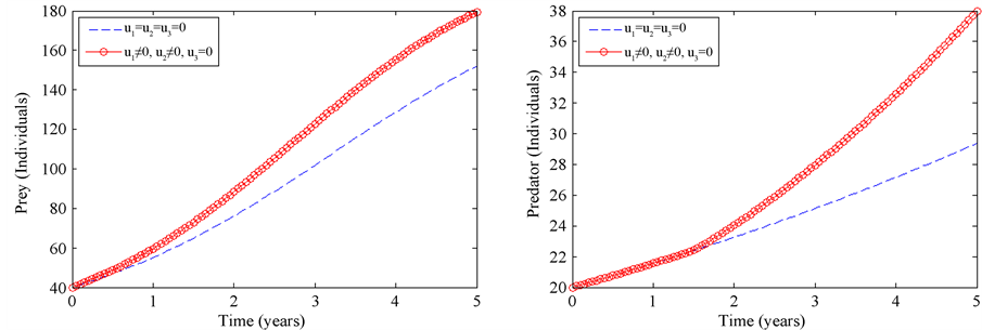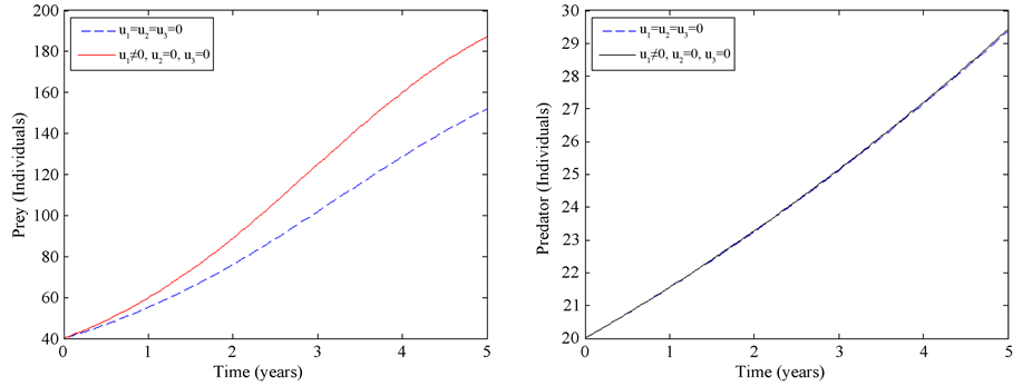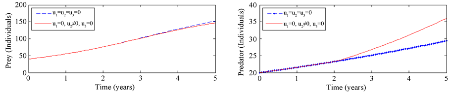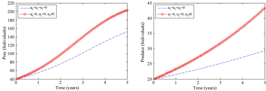 Next, we investigate the effect of the following optimal control strategies on the threatened prey-predator population.
