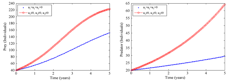 Figure 3. Simulations of a threatened prey-predator model showing the effect of optimal application of construction of dams.