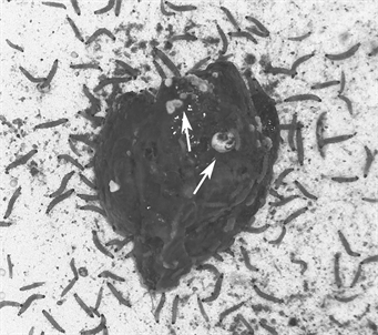 Figure 2. A detail of the same material at about four hours after, showing a little bit more larvae nearby the pellet, with some that have scaled it and can be seen already partially buried (arrows), magnification ×6.