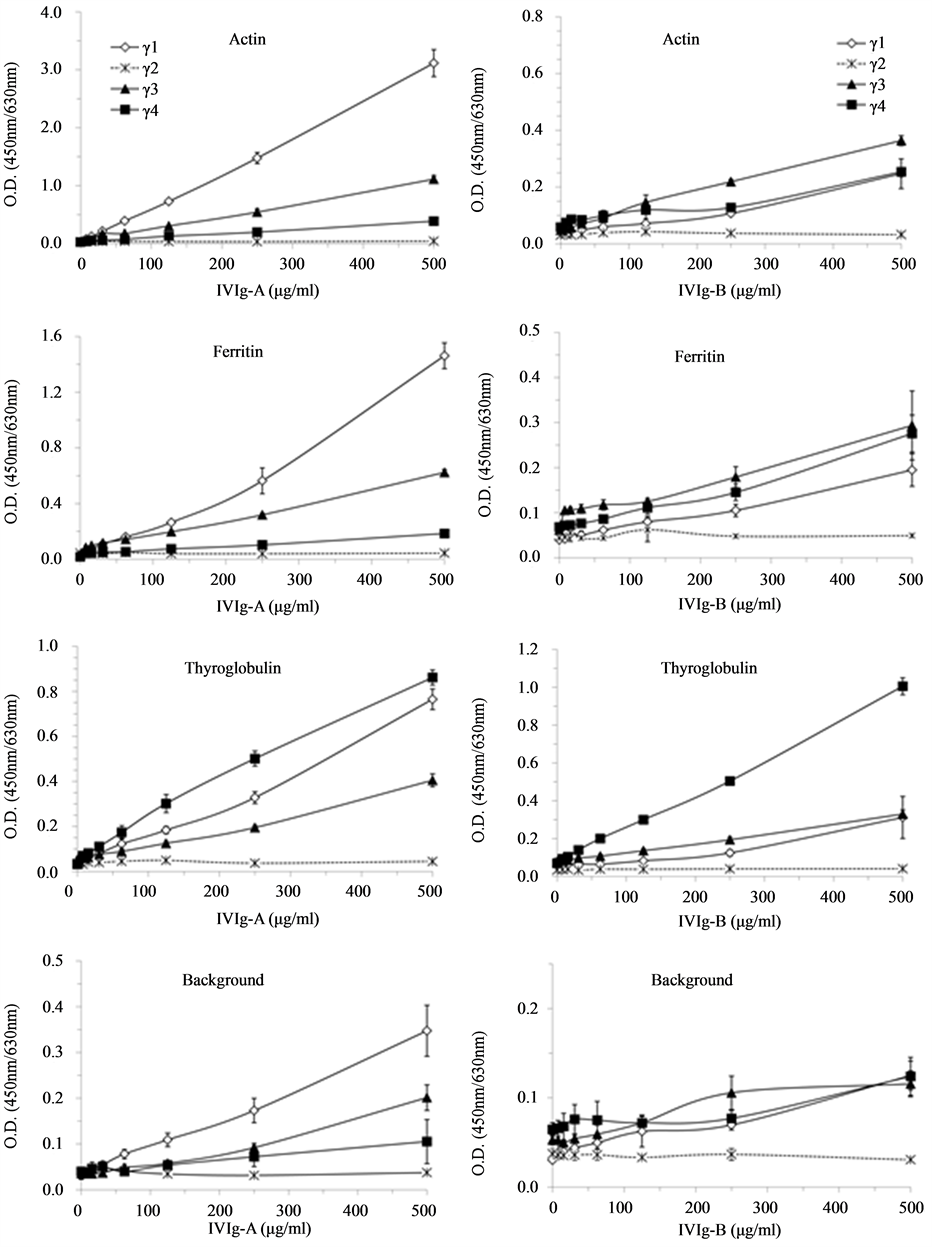 Based on the above observations, titration of IVIg reactivity was done to evaluate the strength of IgG1, IgG2, IgG3 and IgG4 binding on human ferritin and thyroglobulin, which are targets naturally present in human blood [18] . Serial dilution concentrations were established in function of the total IgG content while reactivity was detected using antibody specific for each IgG subclass. Bovine actin reactivity as well as background was also assessed in parallel using the same serial dilutions of IgG in both IVIg preparations. These results are representative of four independent experimentations using IVIg-A and three using IVIg-B. The relative reactivities of IgG subclasses for actin, ferritin and thyroglobulin were similar to those observed above for both IVIg (Figure 3) and were all directly proportional to their final concentration. IVIg-A was showing high IgG1 background reactivity as above. Overall, the titration for thyroglobulin reactivity corroborated that the high level of anti-thyrog- lobulin antibodies, present in both IVIg, is mainly confined to the IgG4 subclass.