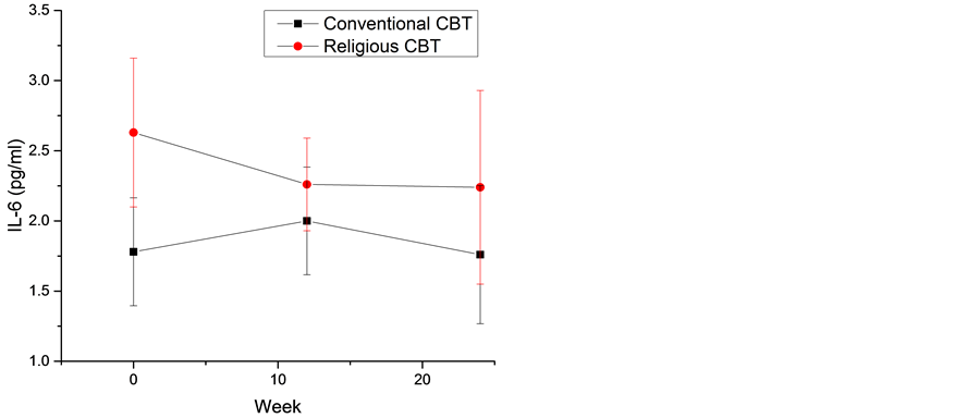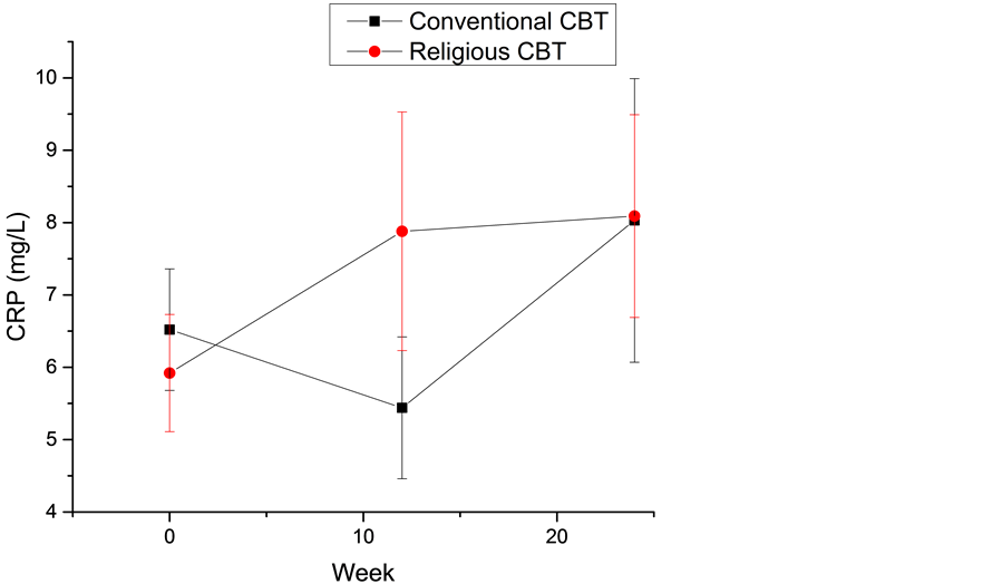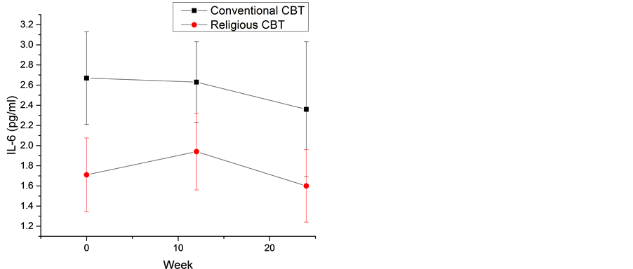 In a recent clinical trial, we found little difference in outcome between religious cognitive behavioral therapy (RCBT) and conventional CBT (CCBT) in the treatment of major depressive disorder (MDD) in patients with chronic medical illness. In a secondary analysis, there was evidence that outcomes were better for more religious people who received RCBT (possibly due to better treatment adherence) [41] . Thus, we decided to compare the effects of RCBT vs. CCBT on changes in immune/inflammatory biomarker and stress hormone levels during treatment in this same cohort.