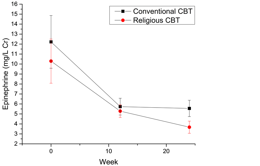 The only findings in this study that supported our hypotheses were the reduction in urinary epinephrine over time as MDD was treated and the interaction of religiosity with treatment type for the marker IL-6. The former is consistent with prior research indicating higher levels of stress hormones in those with MDD and a decline in those hormones in response to treatment [56] . The latter is consistent with our original report that CCBT tended to be more effective than RCBT in the treatment of MDD in those who were less religious, whereas RCBT tended to be more effective in those who were more religious [41] .