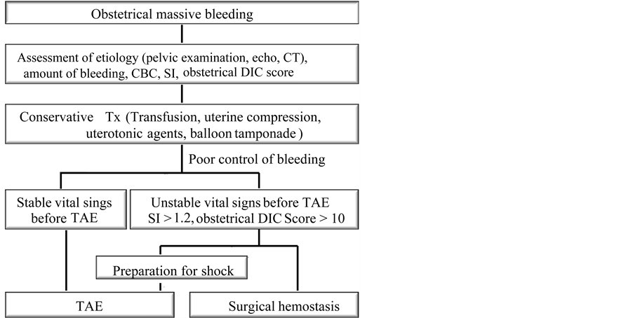 amount of bleeding, complete blood count, the SI, and the obstetrical DIC score for each case, a TAE should be performed for the cases with stable vital signs before the therapy. For the cases with unstable vital signs of SI > 1.2 and/or obstetrical DIC score > 10, it is better to perform a surgical hemostasis or TAE with preparation and intensive care for shock during TAE. In cases of TAE failure, re-embolization or surgical hemostasis should be selected according to etiology and vital signs.