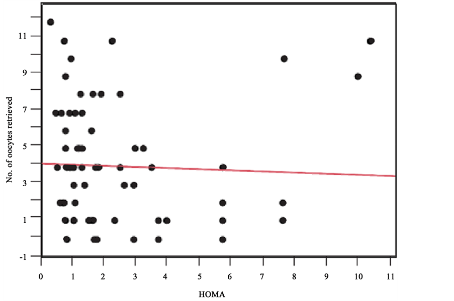 Figure 4. Correlation between the HOMA index and number of oocytes retrieved. There was no correlation between the HOMA index and retrieved oocytes number (r2 = 0.002, p = 0.71).