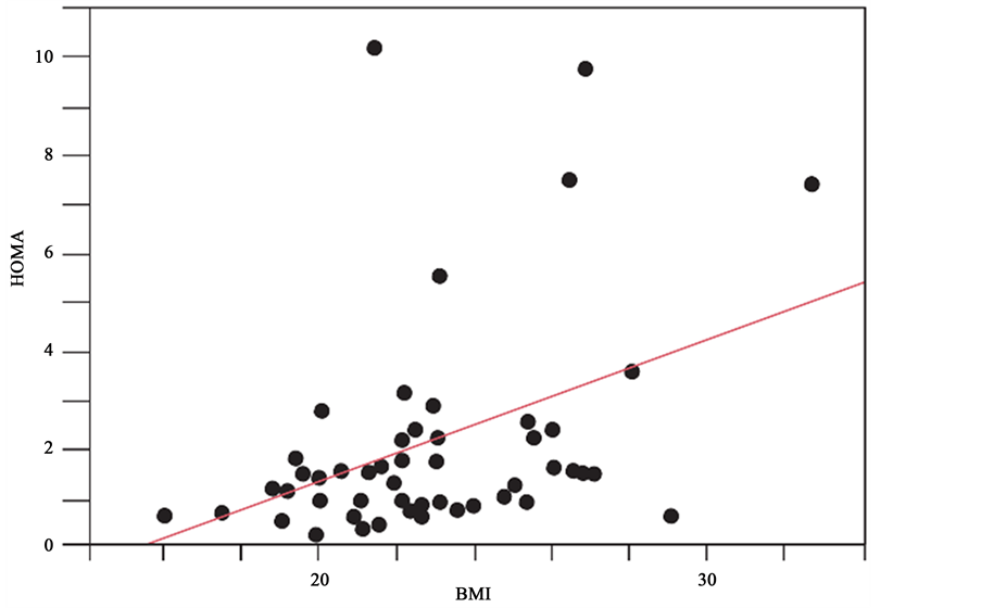 Figure 1. Correlation between the HOMA index and BMI. There was a significant correlation between the HOMA index and BMI (r2 = 0.2, p = 0.0001).