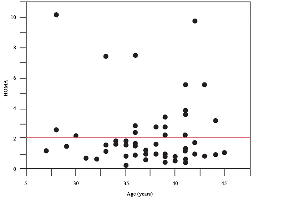 Figure 2. Correlation between the HOMA index and age. There was no correlation between the HOMA index and age (r2 = 0.07e−3, p = 0.9).