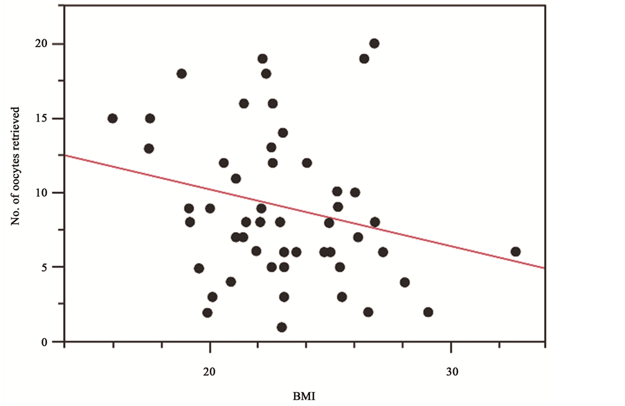 Figure 3. Correlation between BMI and number of oocytes retrieved. The number of retrieved oocytes tended to decrease with an increase in BMI (r2 = 0.05, p = 0.078).