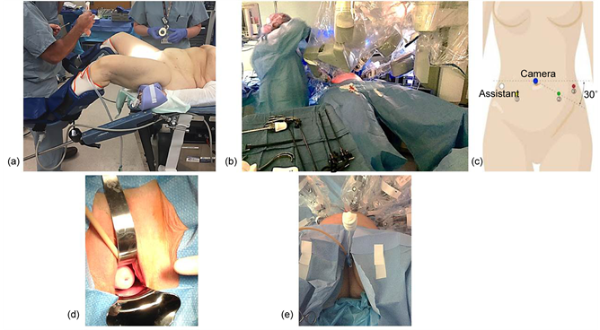 Figure 1. Patient images during robotic assisted laparoscopic apical suspension (RALAS). (a): Patient position, dorsal lithotomy; (b): The Da Vinci SI robot is laterally docked; (c): Trocars configuration; (d): Apical prolapse stage III; (e): V-Care uterine manipulator (ConMed) during surgery.