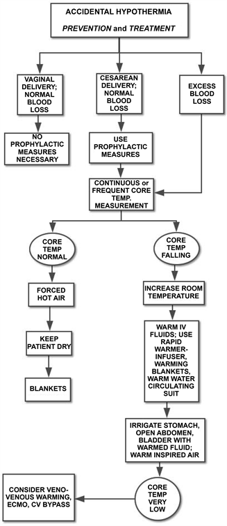 For the obstetrician managing hemorrhage initially it is vitally important that serious attempts to prevent or treat heat loss be made, based on frequent core temperature monitoring. Such efforts may obviate the need for operative intervention. If urgent surgery is necessary, initiating anesthesia in a euthermic patient rather than one with disrupted thermoregulation reduces its risks considerably. Once a hypothermic patient has been rewarmed, she still requires careful surveillance until complete metabolic homeostasis has been restored. Observation for late complications such as infection or cardiac compromise is necessary.