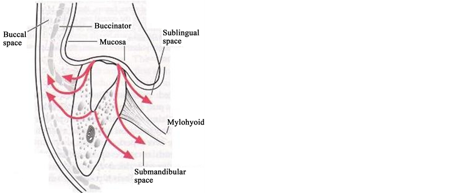 Figure 10. Schematic representation of the air spreading through facial spaces during tooth sectioning by air driven handpiece.