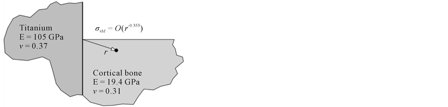 between the two quantities in the isotropic realm (E being the material Young modulus). Moreover, the stress field is known to be singular (i.e. unbounded) at multi-material interfaces under given conditions―see e.g. [20] [21] . In particular, at the first-adherence edge between an implant and the surrounding bone tissues, a singular field is predicted; in the example configuration of a 90˚ angle profile of the bone component (Figure 4), the local stress spike has unbounded components