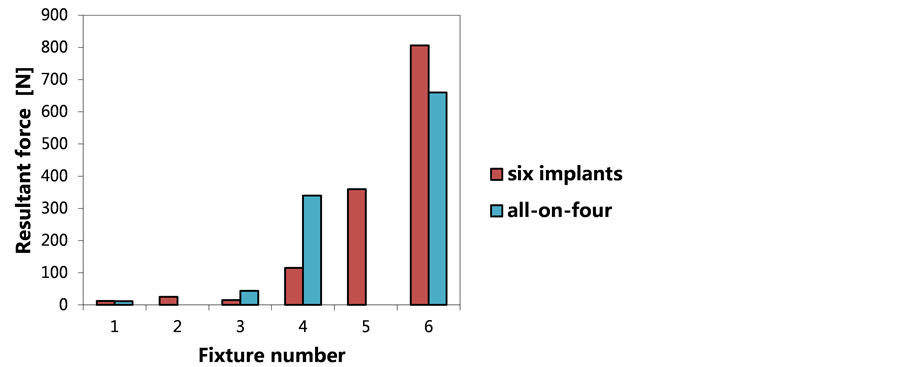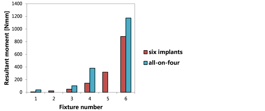 acts on the same fixture in the all-on-four configuration, as shown in Figure 4. It is impossible from the aforementioned data to determine which configuration showed superior performance, it being difficult to meaningfully reduce forces and moments to a common parameter. By conducting a component specific analysis of the resultant load as in Table 3, the data show that only the axial force component is smaller in the all-on-four model, whilst all the others are significantly higher. Because this component is known to be the less critical one [23] , the previous observation suggests that the six-implant configuration performs better than the all-on-four variant. The analysis of V parameter values is coherent with such an interpretation since, as in Table 4, a greater V value was found for the all-on-four configuration for the same geometry, materials, and boundary conditions. In addition, the trend was confirmed by EBS value maps (Figure 7).