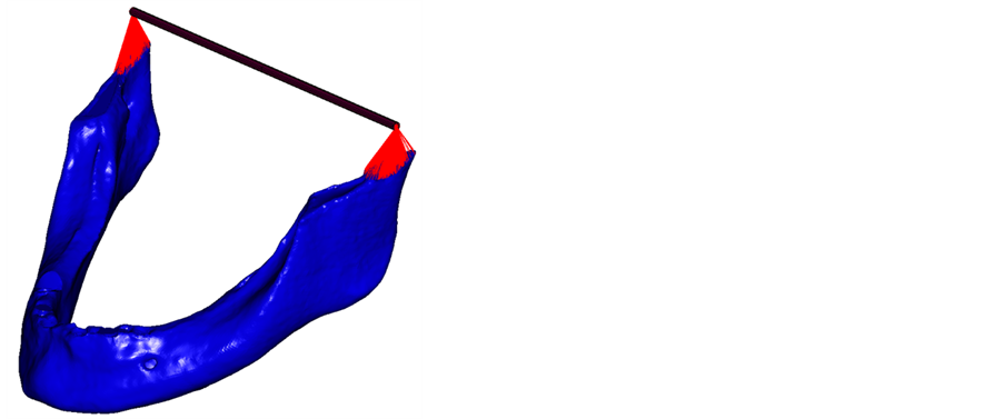 Figure 1. Model of the mandible used in the finite-element analysis. The red links indicate a rigid connection between the condyle zone and the cylindrical joint displayed.